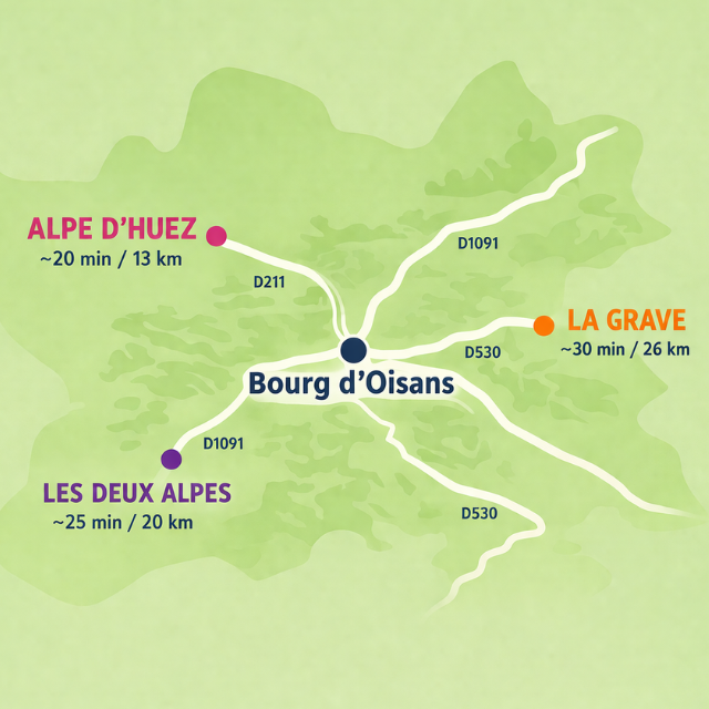 Depuis Bourg d’Oisans, véritable point de départ central, vous accédez facilement aux différentes stations :